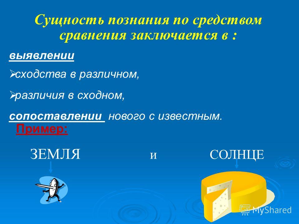 Сущность познания по средством сравнения заключается в : выявлении сходства в различном, различия в сходном, сопоставлении нового с известным. Пример: ЗЕМЛЯ и СОЛНЦЕ