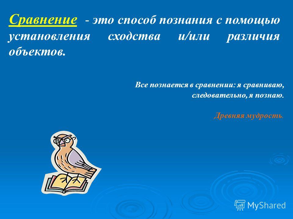 Сравнение — это способ познания с помощью установления сходства и/или различия объектов. Все познается в сравнении: я сравниваю, следовательно, я познаю. Древняя мудрость.
