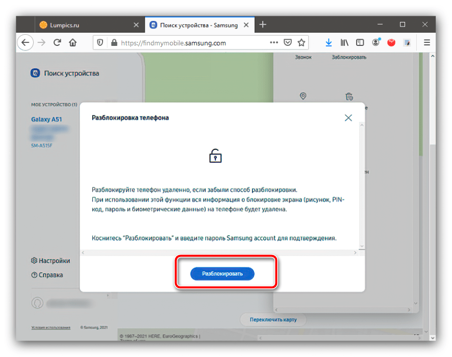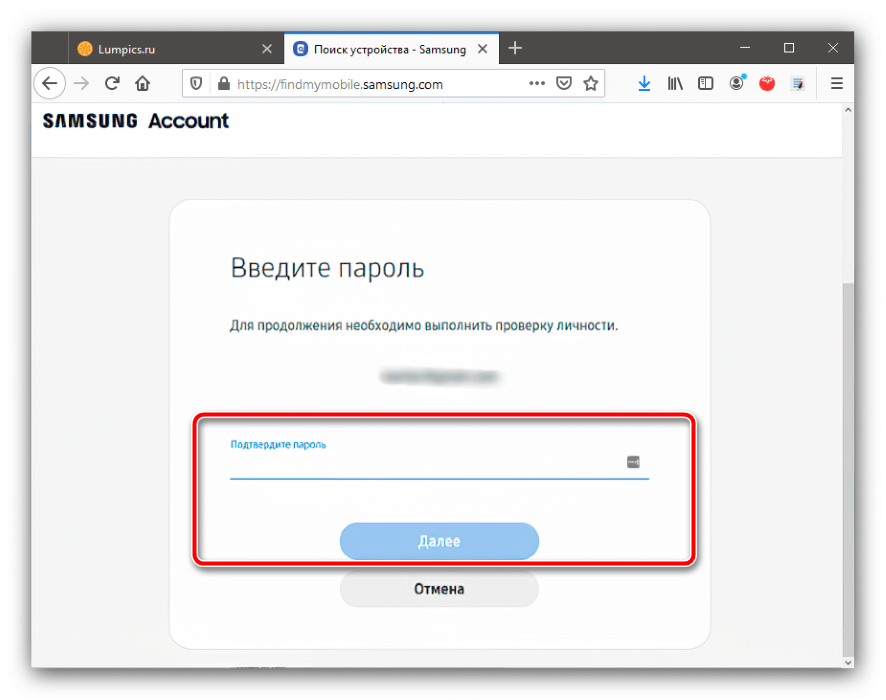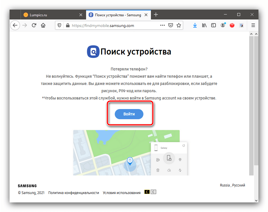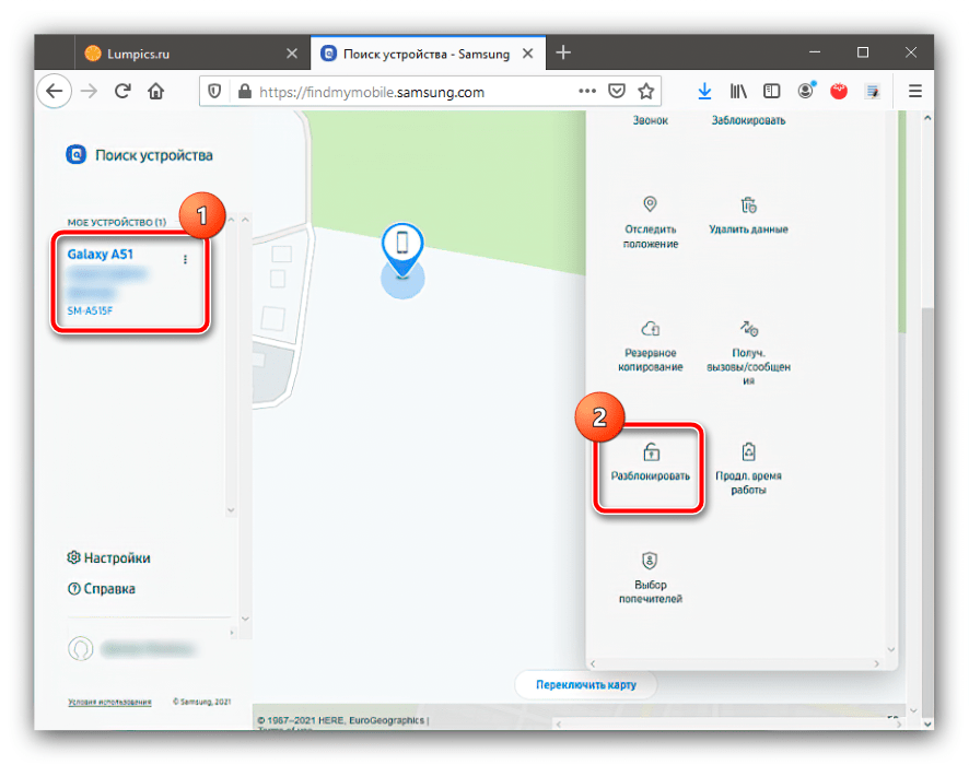 Компания Samsung предлагает пользователям специальный сервис, который позволяет выполнять удалённые манипуляции с девайсом, в том числе и сбрасывать блокировку. Для работы этого инструмента необходимо, чтобы на телефоне было активно подключение к интернету, а также привязана и настроена учётная запись Samsung, пароль от которой вам известен. Если эти требования соблюдены, выполните следующие действия: