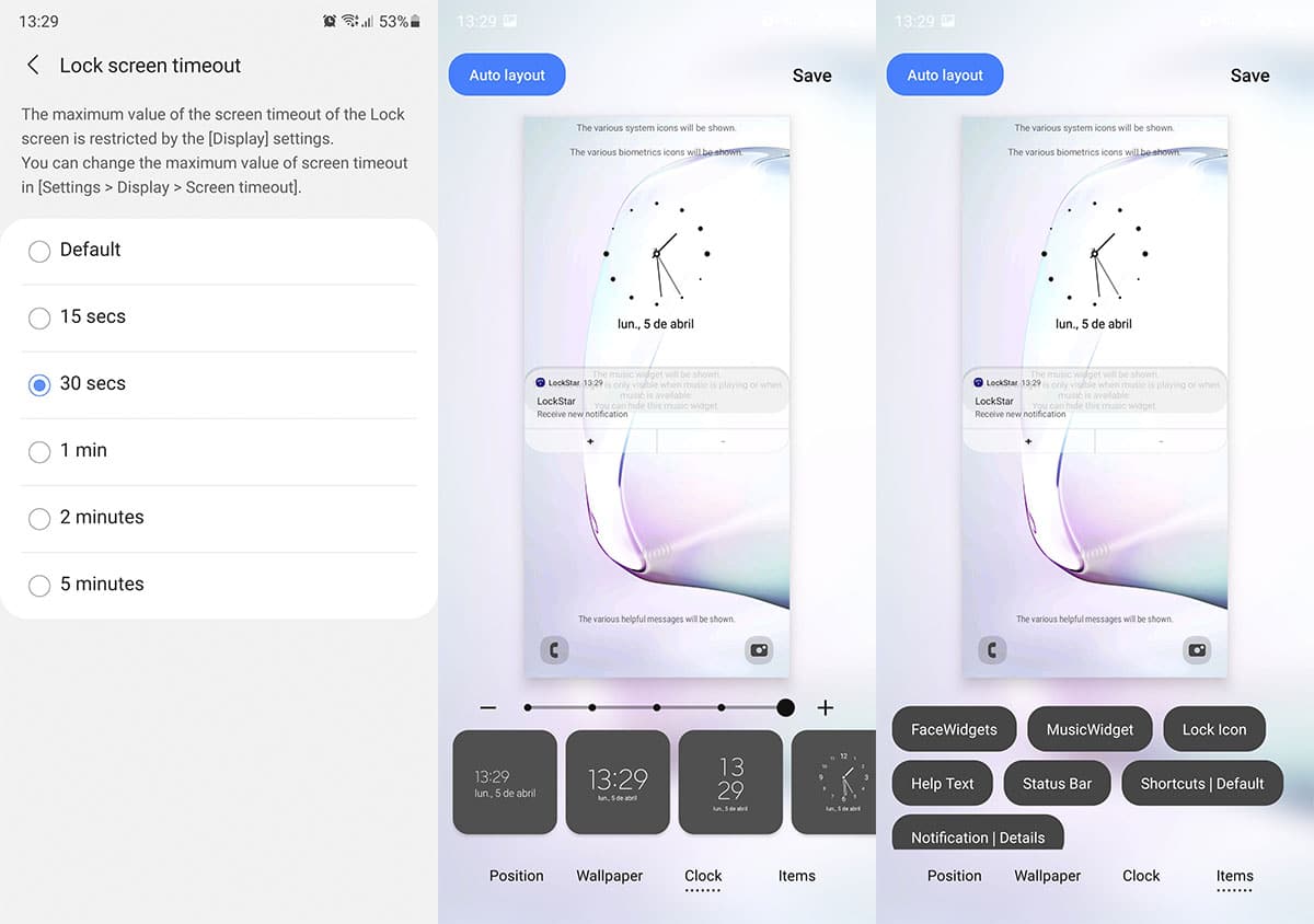 La положение всех элементов, кроме уведомлений, можно перемещать через экран блокировки.