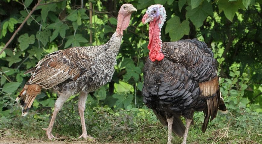 Индюки более крупные, чем индейки. Носовой отросток у самцов более выражен, крупный и упругий на ощупь