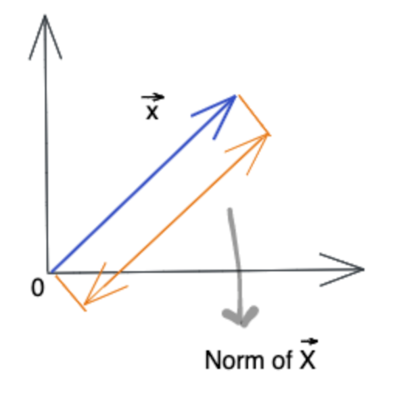 A norm is a way to measure the size of a vector, a matrix, or a tensor. In other words, norms are a class of functions that enable us to quantify the magnitude of a vector. For instance, the norm of a vector X drawn below is a measure of its length from origin.