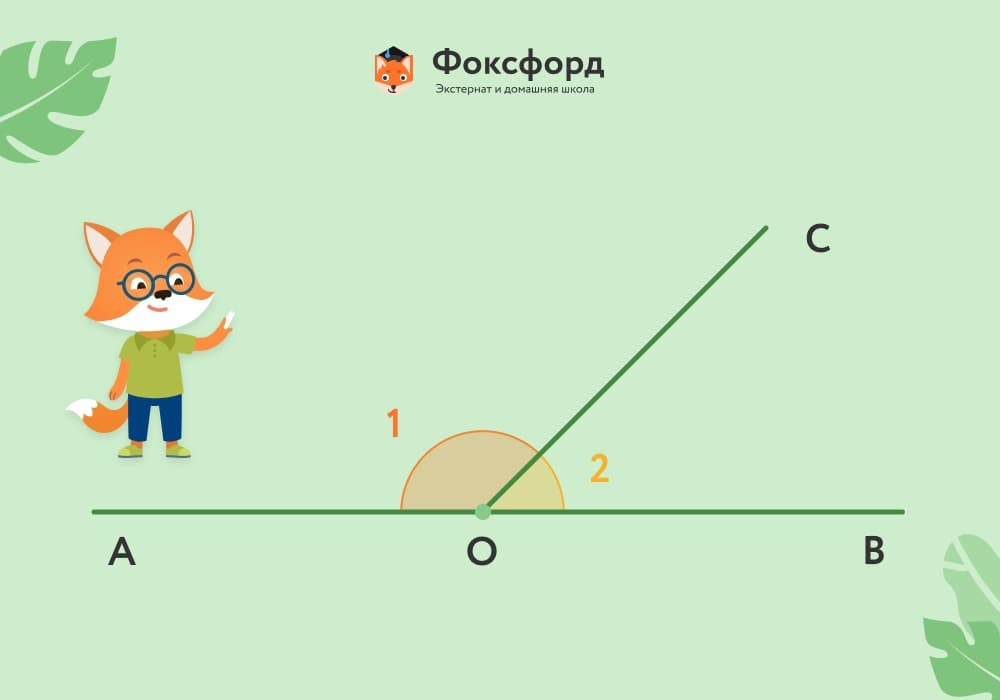 На рисунке луч ОС делит развёрнутый ∡AOB =180° на две части, образуя тупой ∡1 и острый ∡2.