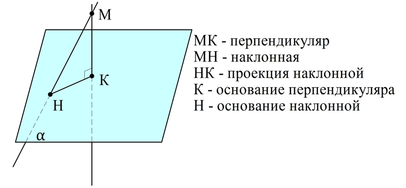 Пусть есть некоторая плоскость α и точка М в пространстве, не лежащая на α. Проведем через М прямую, перпендикулярную α. Она пересечет α в какой-нибудь точке К. Отрезок МК именуют перпендикуляром к плоскости α.