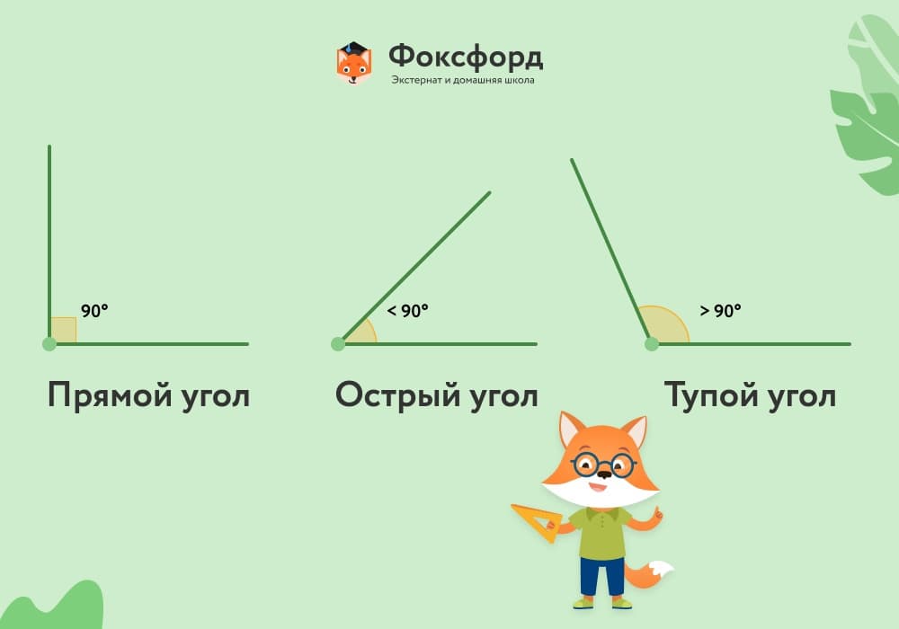 Угол с градусной мерой 90° называется прямым. Если угол меньше 90°, его называют острым, а если больше 90° — тупым. Угол, равный 180° (то есть образующий прямую линию), называют развёрнутым.