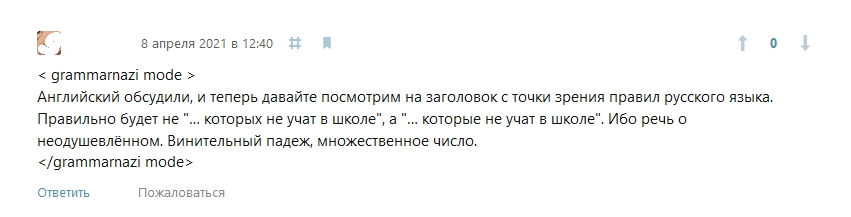 И читатели создали огромную ветку комментариев, где разобрали этот конкретный пример по теории английского. Было познавательно! Когда мы это всё заметили, стало даже жалко удалять эту ошибку. Но пришлось — всё же у школы английского с грамматикой языка должно быть всё в порядке, даже в таких мелочах.