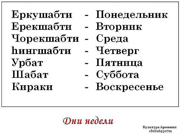 С новым годом! — Շնորհավոր Նոր տարի — Шноравор Нор тариС рождеством — Շնորհավոր Սուրբ ծնունդ — Шноравор Сурб ценунд С днем рождения — Ծնունդդ շնորհավոր — Ценундт шноравор Желаю удачи — Հաջողություն եմ ցանկանում — Аджохутюн эм цанканумЖелаю счастья — Երջանկություն եմ ցանկանում — Ерджанкутюн эм цанканум
