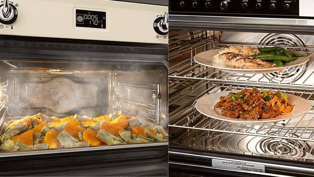 - в духовых шкафах, обладающих таким функционалом, можно одновременно готовить несколько блюд, используя для каждого из них отдельный противень;