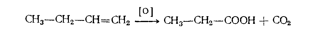 Когда алкен окисляют избытком щелочного перманганата в случае крайнего расположения двойной связи будет образовываться кислота и углекислый газ: