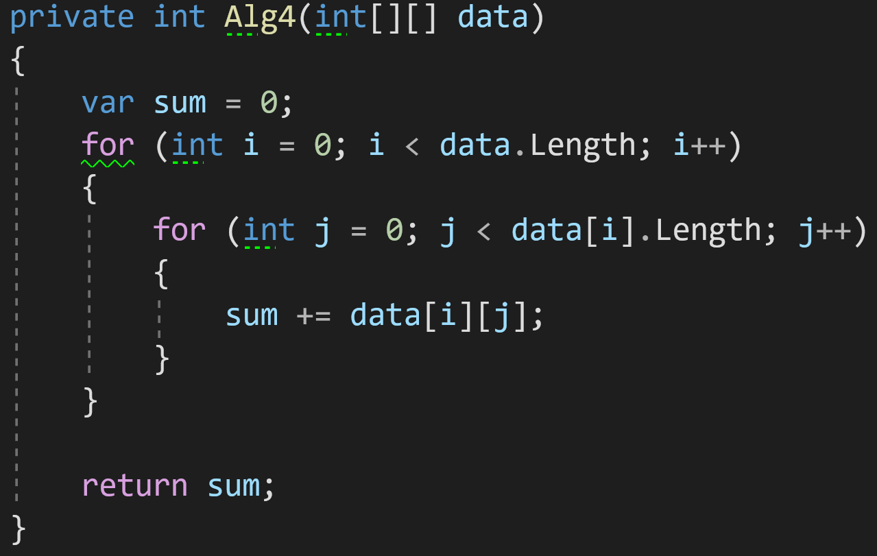 Сложность внешнего цикла в нашем примере — O(N), сложность внутреннего цикла — O(N) (или O(M), если массив не квадратный). Согласно правилу, две эти сложности должны быть умножены. В результате максимальная сложность всего алгоритма будет равна O(N^2).