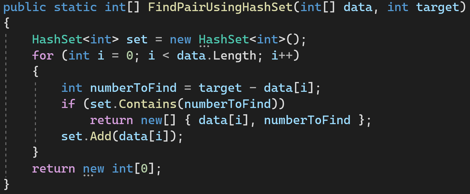 Проходимся по массиву и добавляем элементы, которые мы уже проверили, в HashSet. Если HashSet содержит недостающий для суммы элемент, значит всё хорошо, мы закончили и можем возвращать результат.