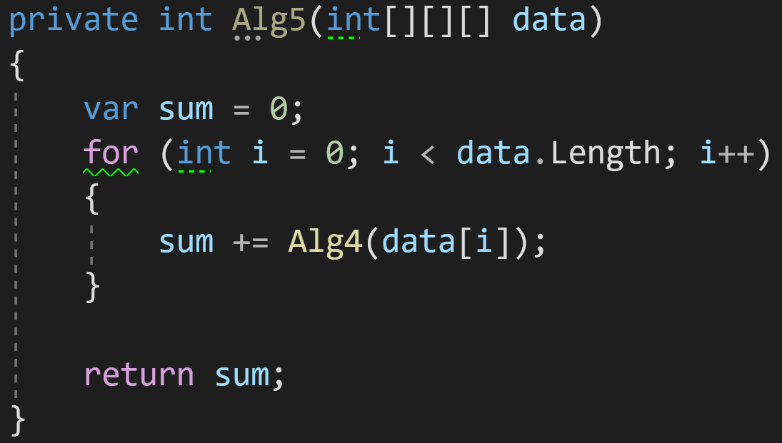 А что мы видим тут? Цикл — уже известная нам сложность O(n), но внутри вызывается функция Alg4() из предыдущего примера:
