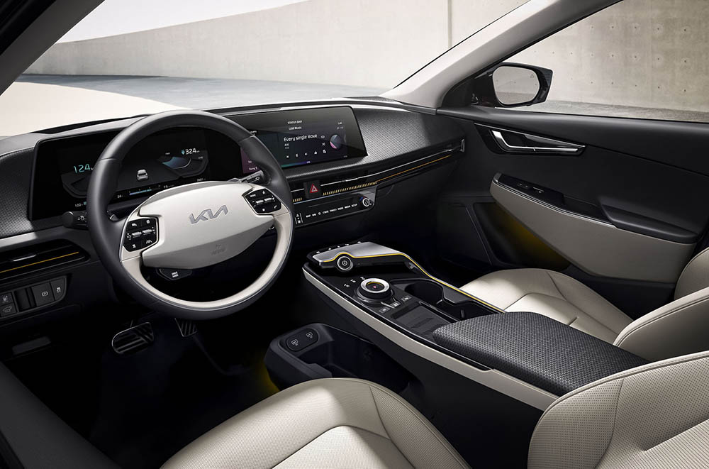 Интерьер автомобиля Kia EV6 имеет современный и минималистичный дизайн, который придаёт ему элегантность и простоту. Отделка салона автомобиля выполнена из высококачественных материалов, создавая ощущение премиальности и роскоши. Просторный и открытый дизайн салона создаёт ощущение свободы.