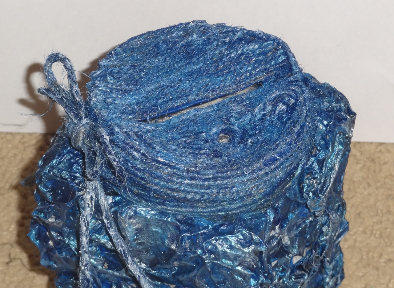 Теперь возьмем клей Титан и обмажем им горлышко и места где заканчивается картонная заготовка. Оставить клей подсохнуть на 5 минут, а затем аккуратно по кругу уложить на него упаковочную веревку. Можно использовать мешковину, или шерстяную нить.