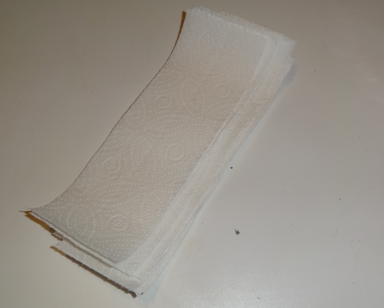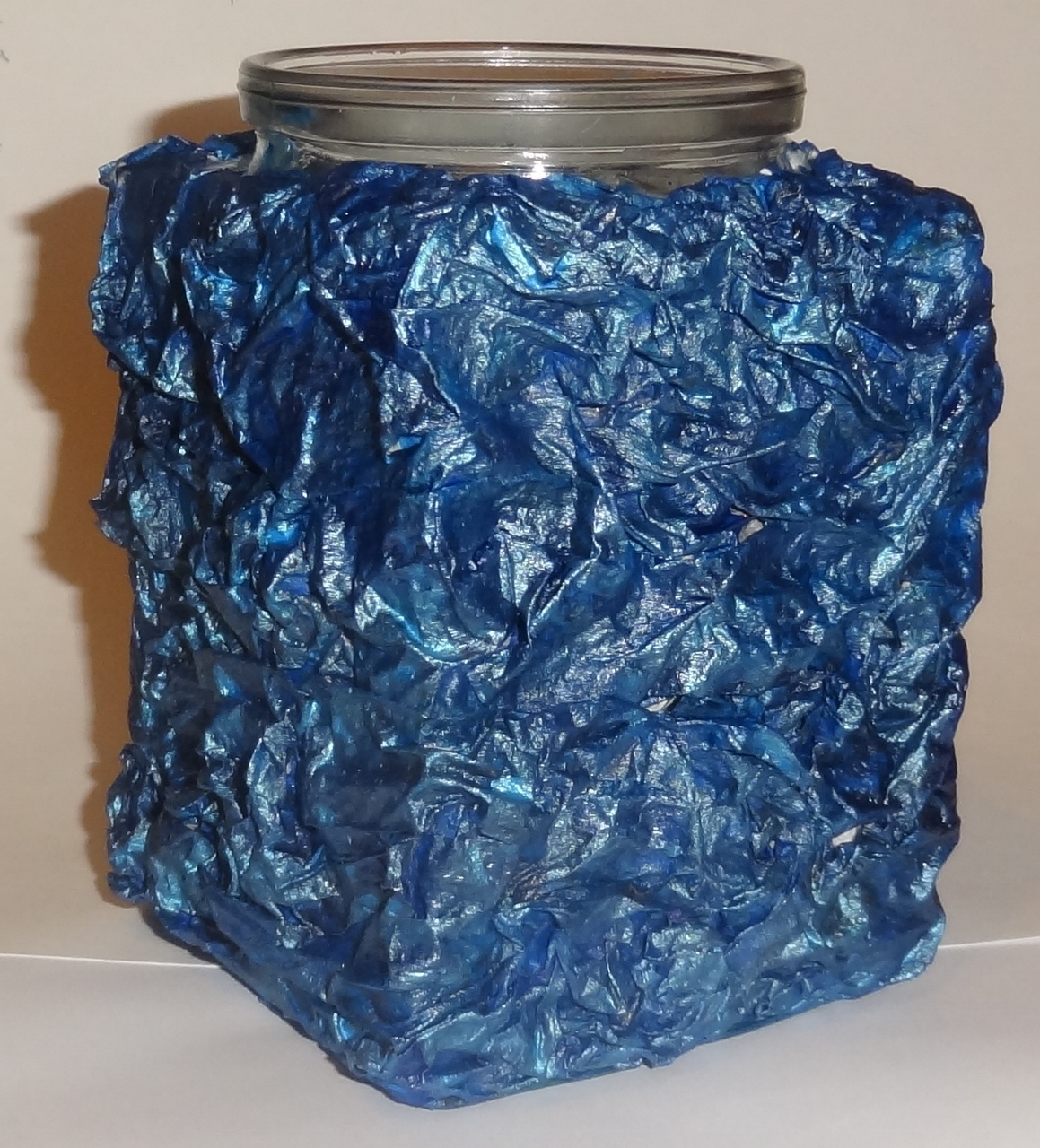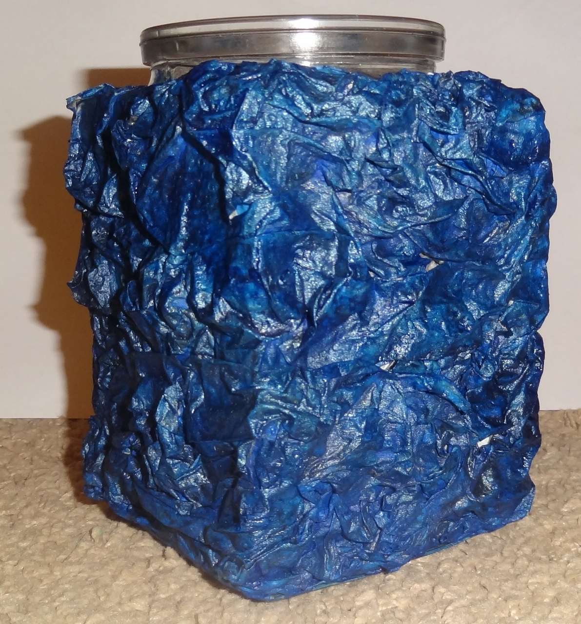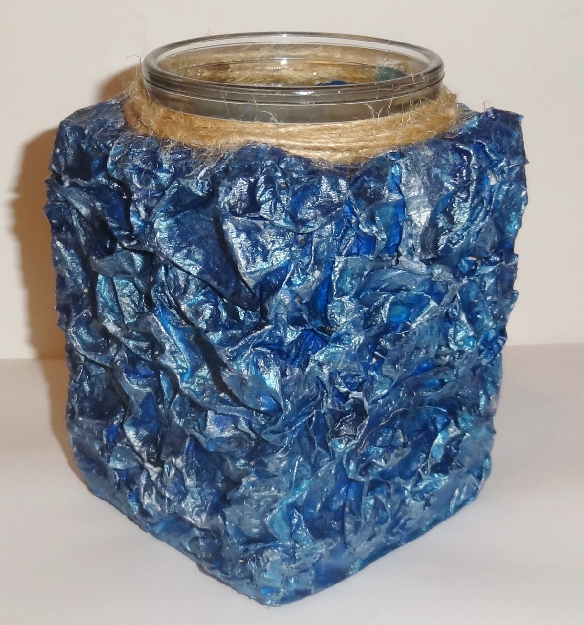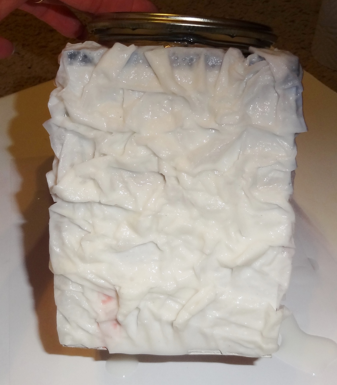 Бумажные полотенца нарезаем на полоски. Клей ПВА разводим в пропорции 1:1. Полоски макаем в клей и, пропуская между двух пальцев для легкого отжима, располагаем на банке, имитируя складки.