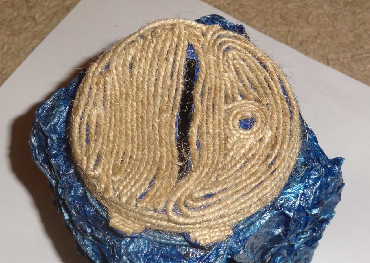 Декор крышки осуществляем так же с помощью клея Титан и веревки, укладывая произвольно, как захочется.