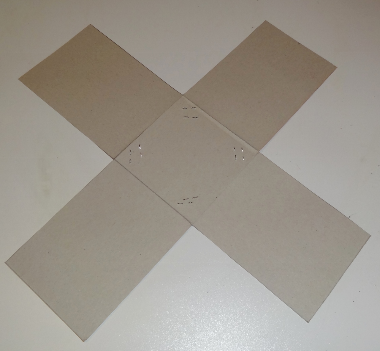 Теперь эти полоски необходимо скрепить между собой крест накрест, совместив там, где у нас будет дно банки. Места соединения закрепляем степлером в нескольких местах. Первая заготовка готова.