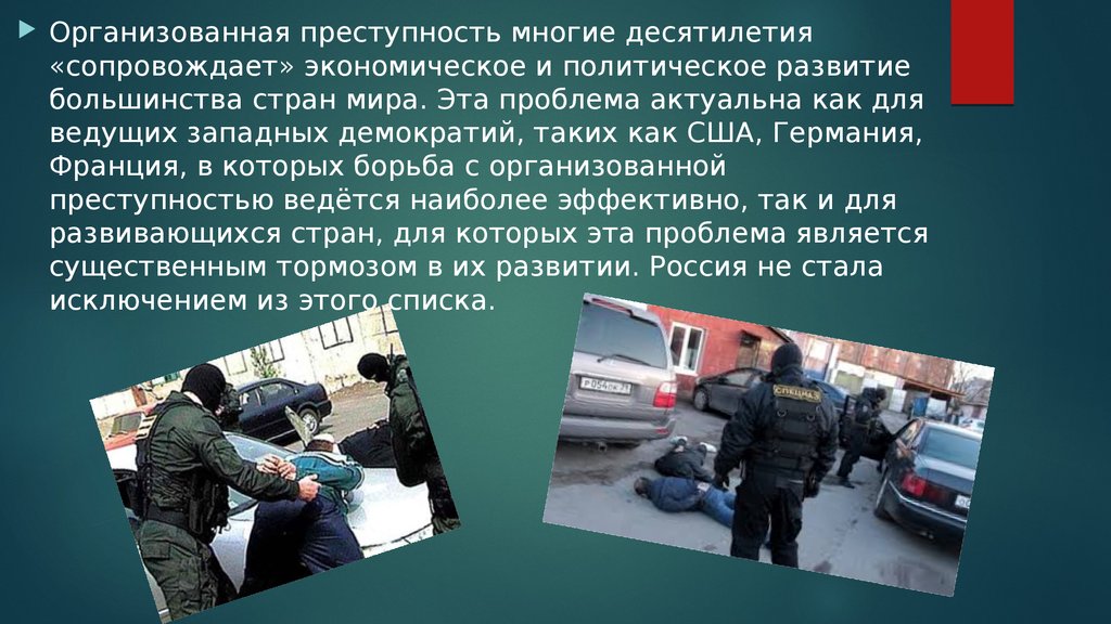 3. Организованная преступность: Организованная преступность играет значительную роль в криминальном мире и может быть показателем того, насколько распространена и зловеща криминальная активность. Под организованной преступностью понимается существование группировок, организованных по определенному принципу, с целью совершения серьезных преступлений.