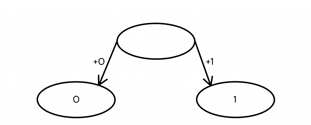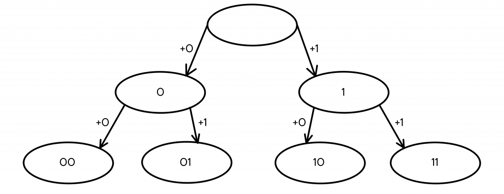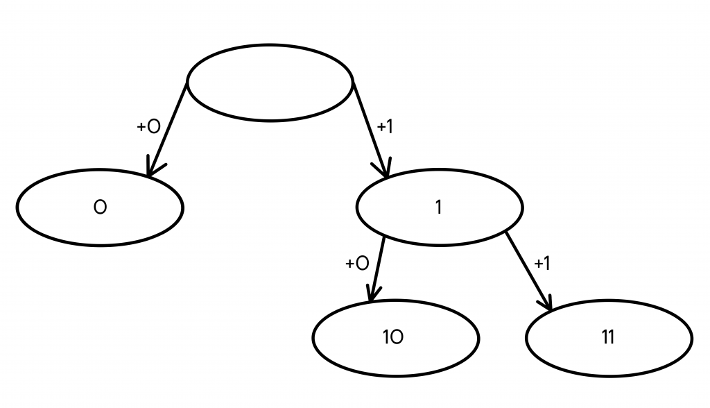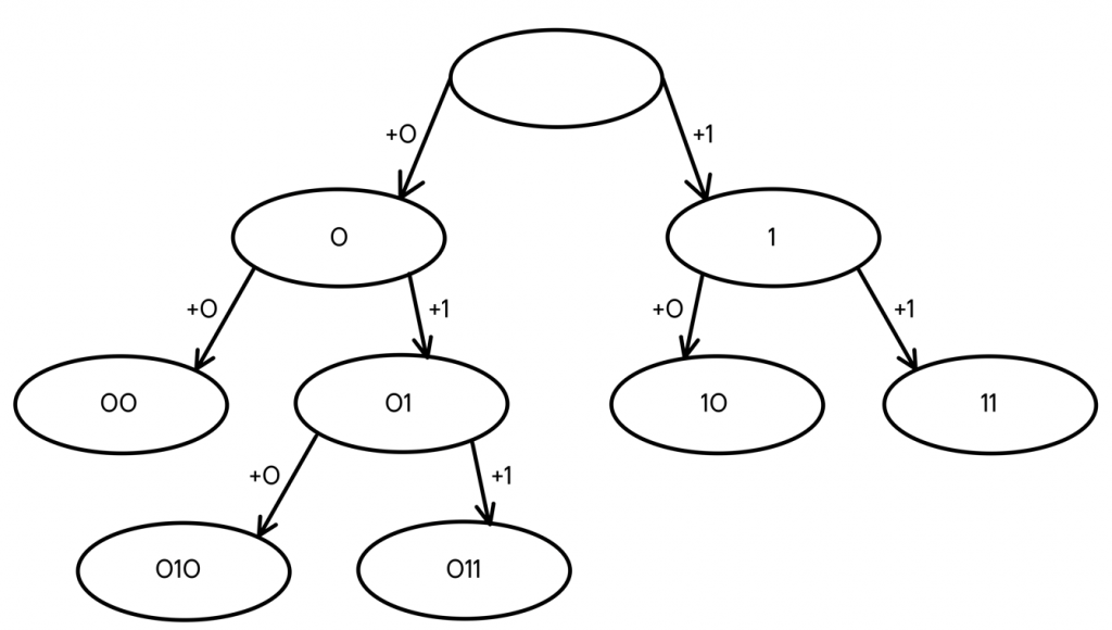 - Первые два кодовых слова, которые мы можем получить из ничего — 0 и 1.Чтобы продолжить построение дерева, выбираем любой из конечных узлов и также добавляем ему 0 и 1 в конец.