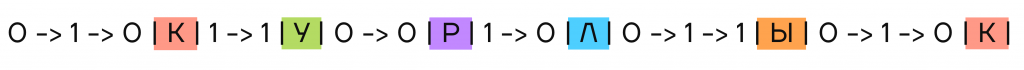 Представим, что мы передаем слово КУРЛЫК разными вариантами, но при передаче допускаем ошибку в четвертом бите (в четвертом символе нашего кода). Посмотрим, что получится в итоге.