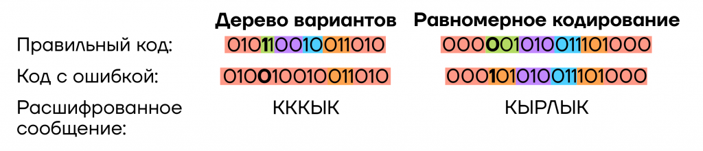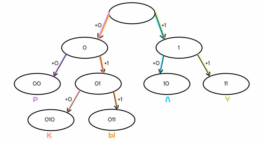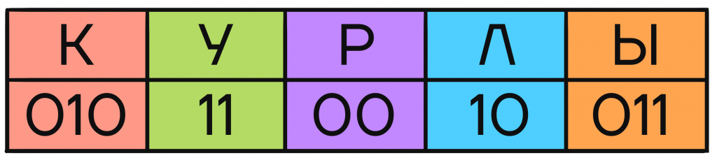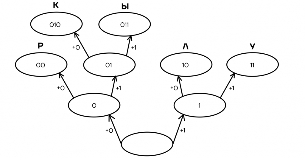 В составленных нами в самом начале статьи кодовых словах это условие нарушалось — код буквы К (010) начинался с кода буквы У (01), а код Ы (001) — с кода Р (00). Из-за этого мы не могли быть точно уверены, где закончилось кодовое слово, а где оно продолжается.