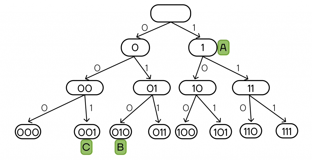 Очень просто строить код, который будет удовлетворять условию Фано, с помощью дерева вариантов — структуры, в нашем случае помогающей получить кодовые слова максимально просто и понятно. Принцип работы дерева состоит в том, что в его узлах будут находиться кодовые слова, а из узла могут выходить два ребра, соответствующие добавлению в конец кодового слова 0 и 1, таким образом заменяя одно кодовое слово на два новых, которые длиннее на один символ.