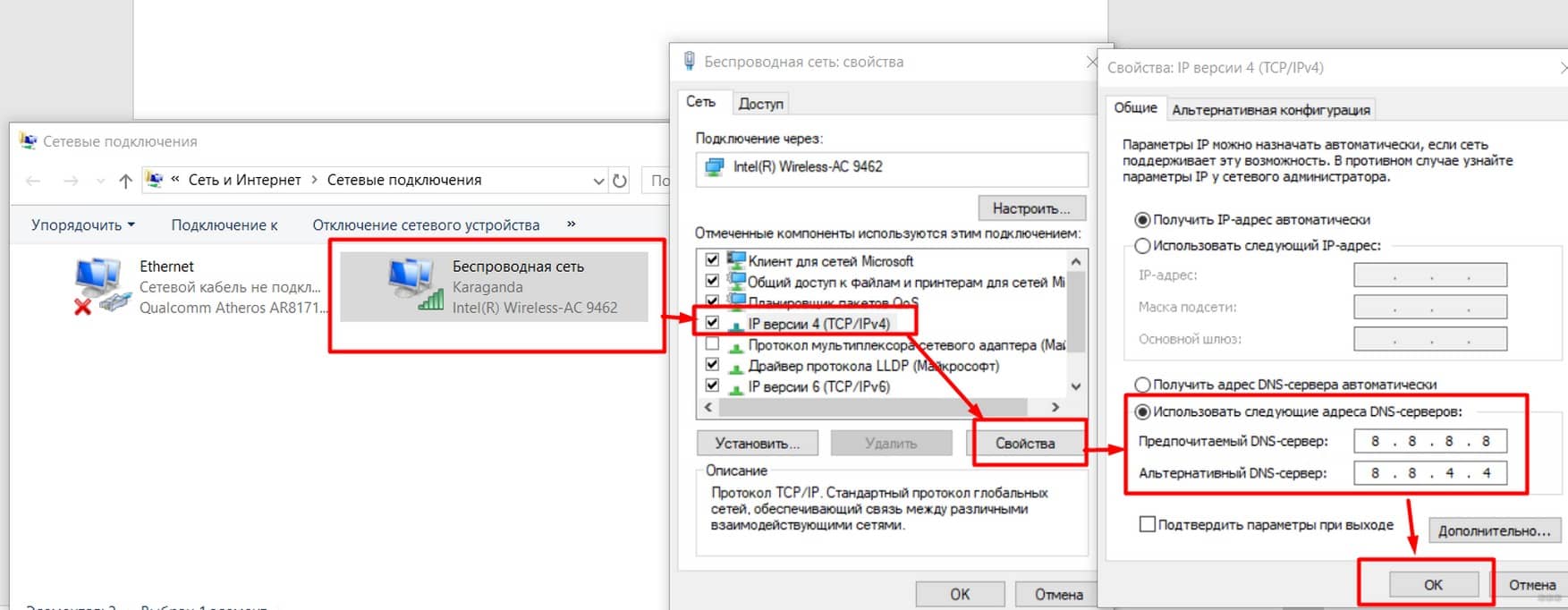 - Активируйте опцию «Использования следующих IP адресов DNS». В первой графе укажите «8.8.8.8» и во второй «8.8.4.4». Нажмите «Ок» для сохранения и закройте окна.