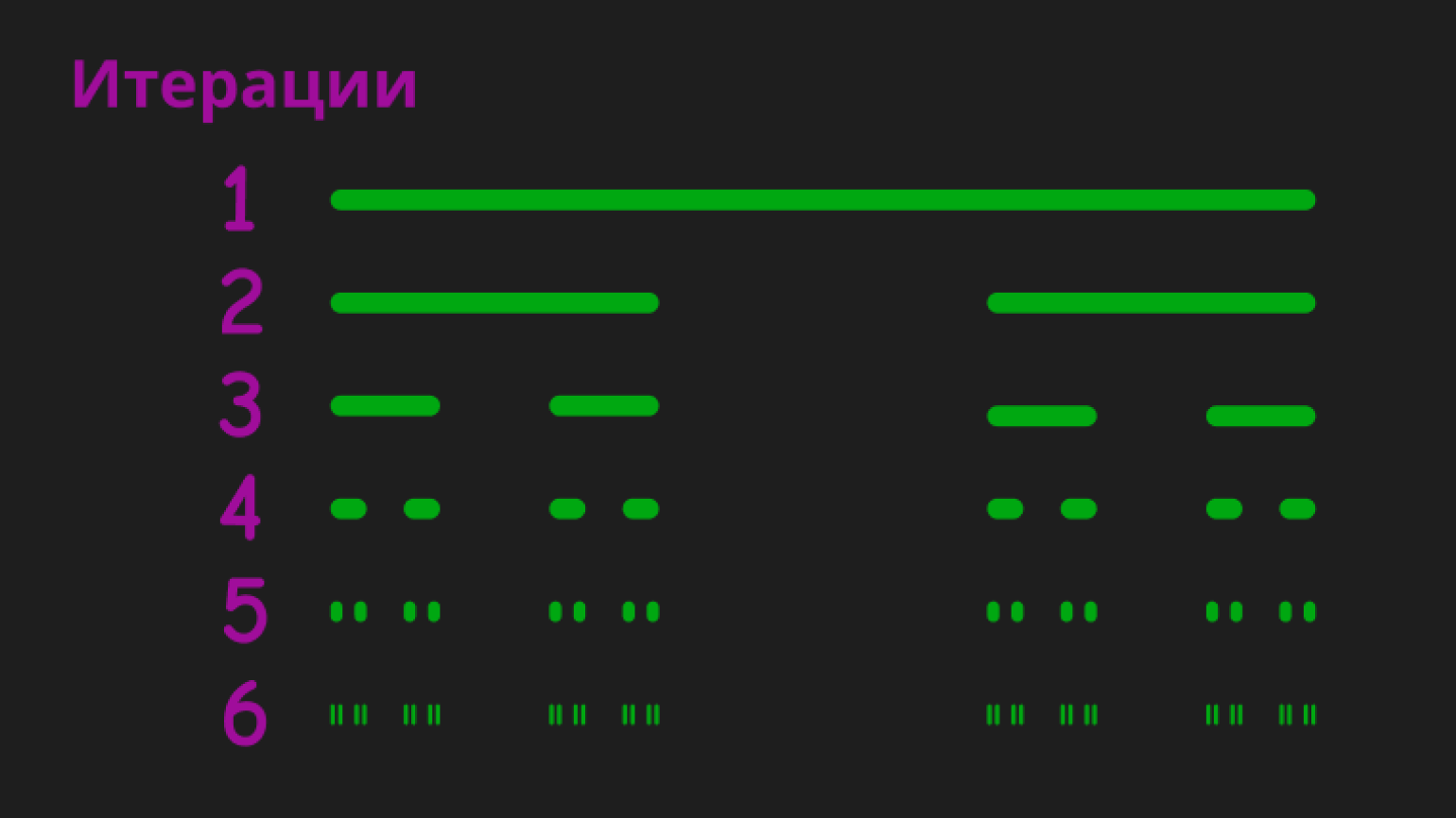 Итерация — это повторение одного и того же действия, или, по аналогии с программированием, одно прохождение тела цикла. На первой итерации у нас был один отрезок, на второй мы получили два, на третьей — четыре и так далее. Если повторять это несложное действие бесконечное количество раз и увеличить масштаб изображения, то мы увидим ту же самую картину, что и в самом начале. Это и есть визуальное воплощение самоподобия:
