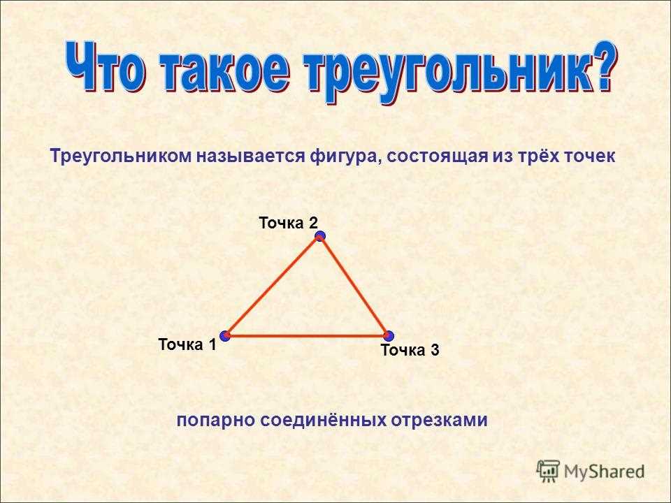 Треугольник — это геометрическая фигура, состоящая из трех отрезков, называемых сторонами, и трех точек, в которых стороны пересекаются, называемых вершинами. Треугольник является одной из основных и наиболее изученных геометрических фигур.