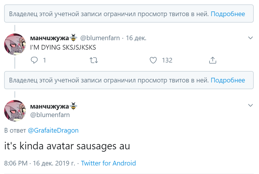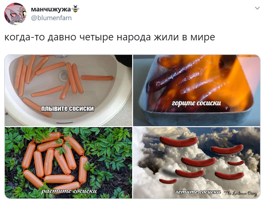 Наконец, в комменты пришла автор вирусного поста @blumenfarn. Она объяснила, что четыре картинки с сосисками – это отсылка к анимационному сериалу “Аватар”. Каждая из них символизирует природную стихию (вода, воздух, земля, огонь).