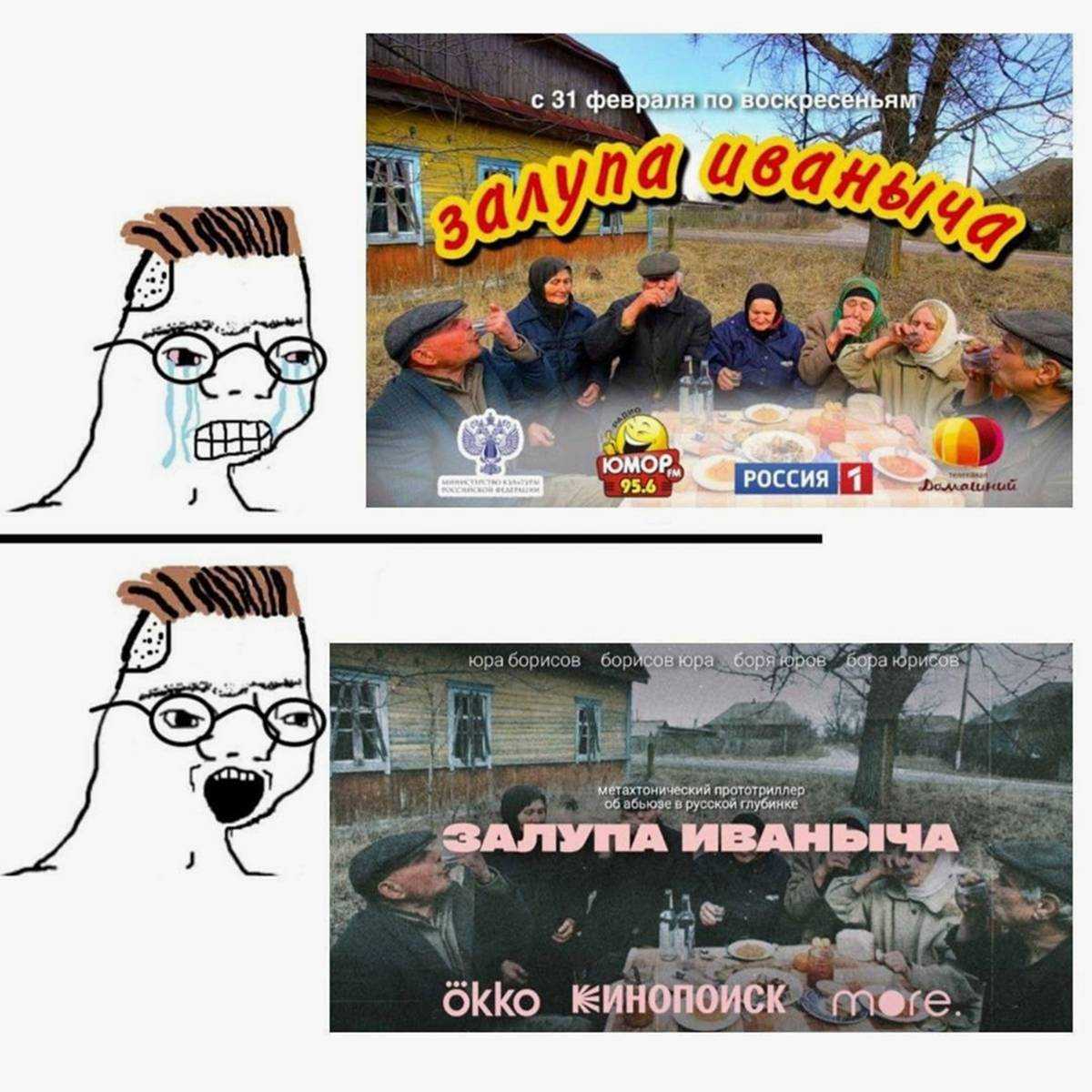 Картинка — стеб над современным потреблением российского контента. Над людьми, которые готовы плеваться от контента федеральных каналов, но легко ведутся на тот же продукт под «модной» вывеской. Достаточно поработать над оформлением, добавить упоминание социального комментария, перенести проект на стриминги и привлечь популярных актеров — на второй афише четыре раза упоминают Юру Борисова. При этом суть не меняется: кино про Иваныча все еще остается той же историей про глубинку.