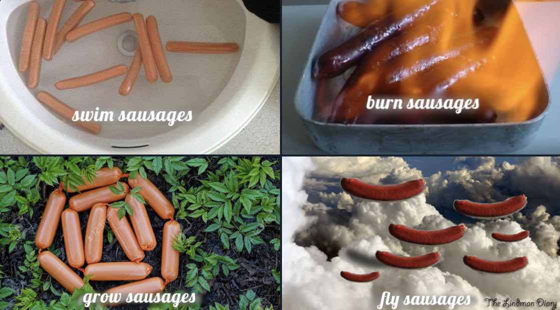 Плывите сосиски, горите сосиски, растите сосиски, летите сосиски.
