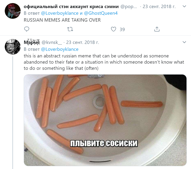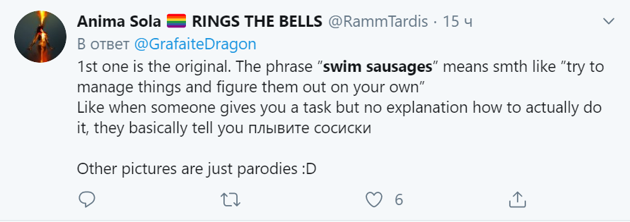 В русскоязычном твиттере снова стал популярным старый мем “Плывите сосиски”. Настолько популярным, что его обсуждают иностранцы. Но даже узнав перевод, они не могут понять его смысл.
