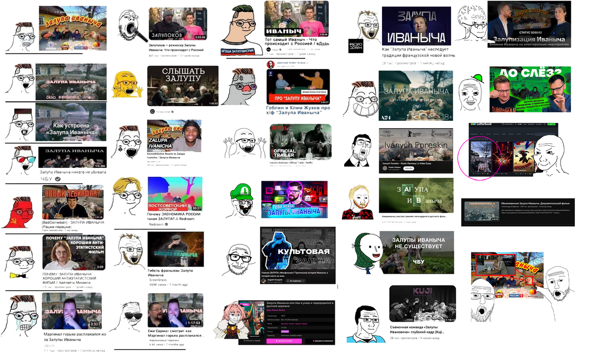 Мем с двумя обложками распространился по сообществам, а пользователи продолжили цепочку. Вслед за фильмом они выдумали общественный резонанс и добавили пародийные обложки аналитических материалов, видеоэссе, реакций и обзоров от блогеров с «Ютуба».