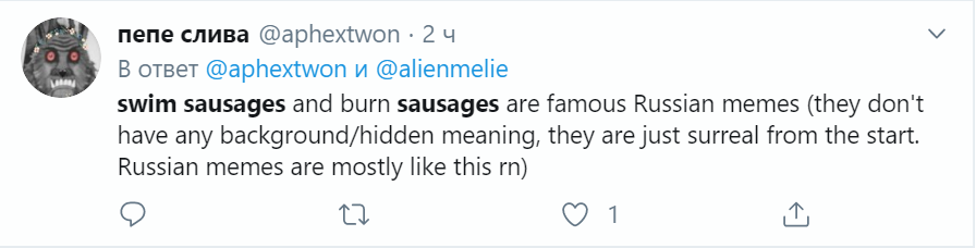 Суть в том, что это слишком трудно объяснить. Духовный уровень. Если вы не русская, вы сможете понять, но эти сосисочные мемы слишком восхитительны, чтобы осознать их во всей красе.