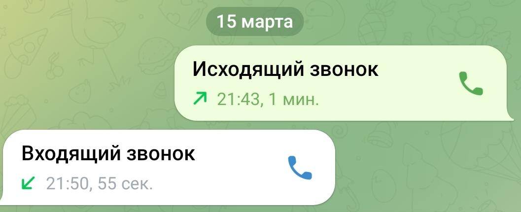 Каждый телефонный разговор сохраняется в диалоге с пользователем. Выглядит как обычное сообщение в чате: