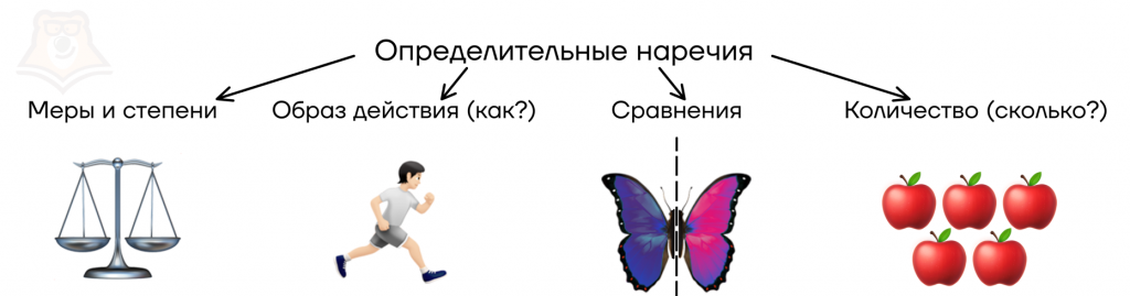 Определительные наречия примыкают к глаголам, прилагательным, существительным и наречиям. В зависимости от их значения в русском языке выделяют несколько разрядов определительных наречий: