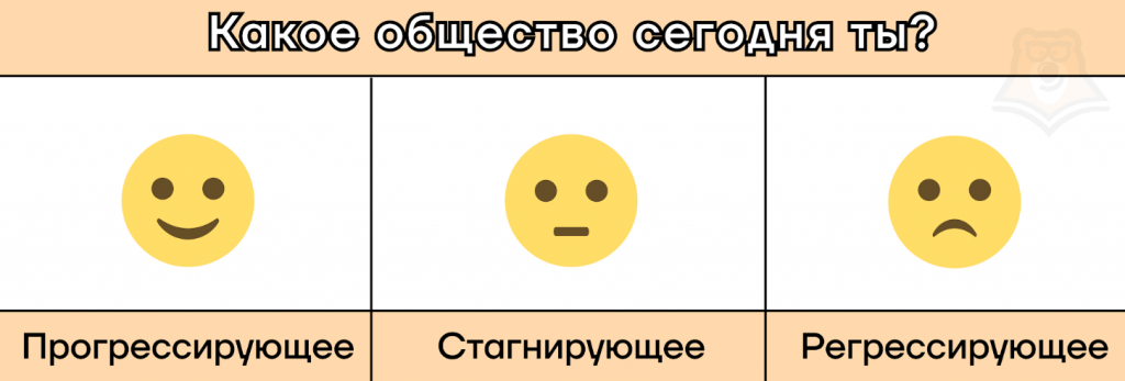 Важно понимать, что есть и третий вариант общественного развития — стагнация, при которой общество замедляет свое развитие и как бы замирает, стоит на одном месте, как машины в пробке. Но подобная «пробка», в которую может попасть общество, обычно оказывается намного продолжительнее автомобильной, стагнация может длиться годами