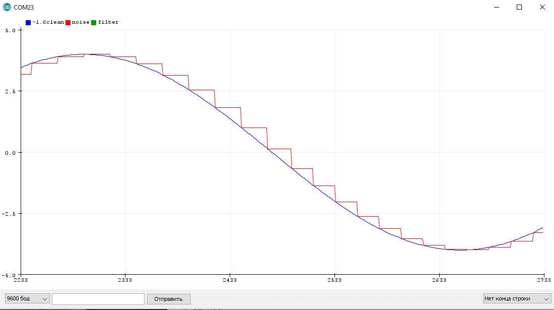 Давайте посмотрим, как измеряется сигнал в реальном устройстве. Естественно это происходит не каждую итерацию loop, а например по какому то таймеру. Представим что синий график отражает реальный процесс, а красный — измеренное значение с некоторым периодом.