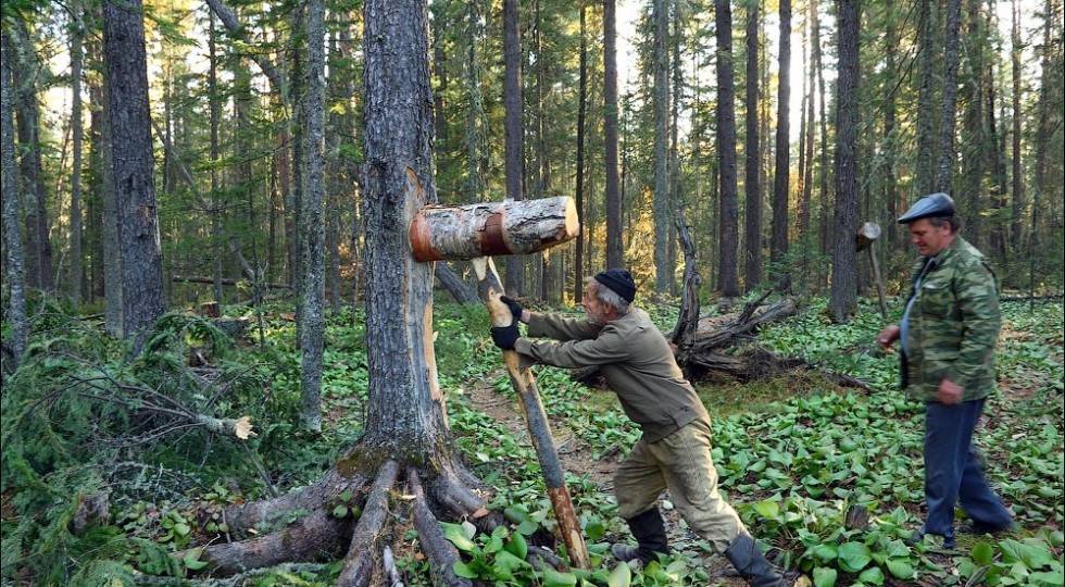 - Сбивание шишек сибирского кедра с помощью ударов ногами и сотрясений веток руками