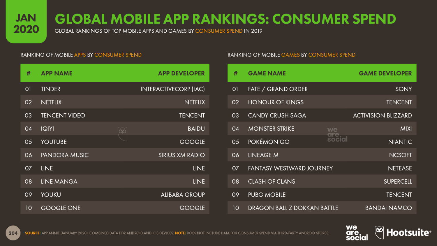 Платная подписка на видео также популярна среди мобильных пользователей. App Annie сообщает, что в 2019 году на видеоприложения приходится 5 из топ-10 неигровых приложений в мире по потребительским расходам. Трое из них — Tencent Video, iQiyi и Youku — ориентированы главным образом на пользователей интернета в Китае. Интернет-пользователи именно этой страны больше всего расположены платить за цифровой контент.