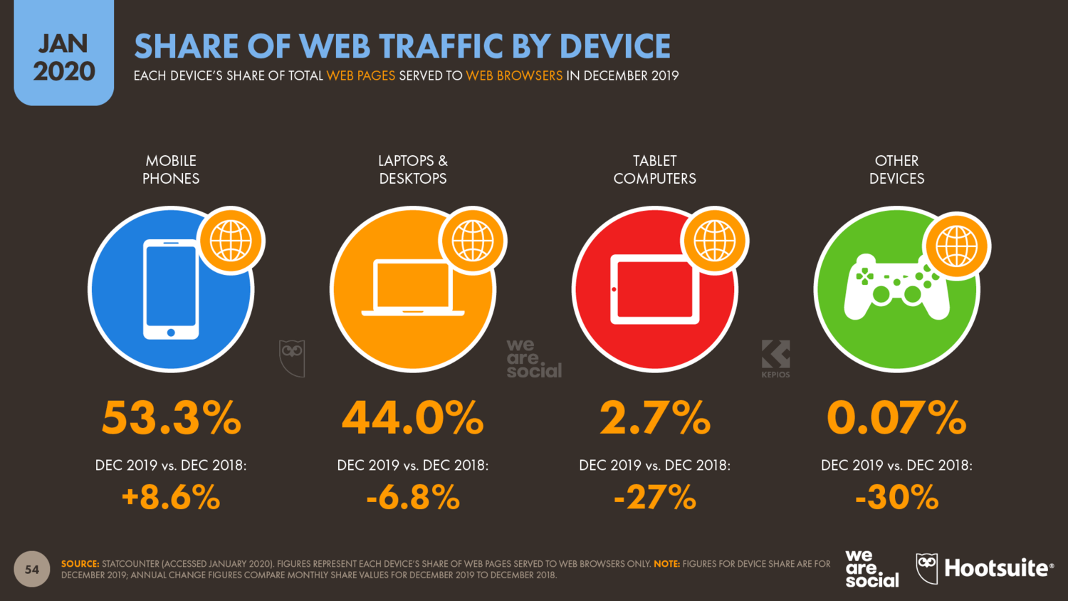 Несмотря на повсеместную распространенность смартфонов, три четверти пользователей интернета в возрасте от 16 до 64 лет всё ещё пользуются интернетом с помощью настольных компьютеров и ноутбуков. Последние данные Statcounter показывают, что примерно 53% всех веб-запросов в настоящее время поступают с мобильных телефонов, но на ПК при этом по-прежнему приходятся оставшиеся 44%.