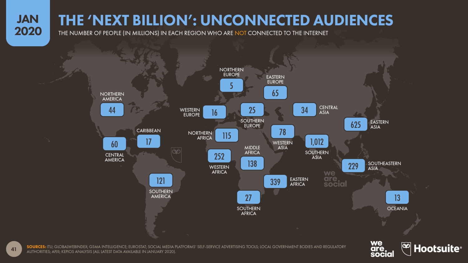 Чуть более 40% от общей численности населения мира — примерно 3,2 млрд человек — по-прежнему не подключены к интернету. Из них более 1 млрд проживают в Южной Азии (31% от общего числа). На страны Африки приходится 27% от общего числа — 870 млн человек ещё не подключены к интернету по всему континенту.