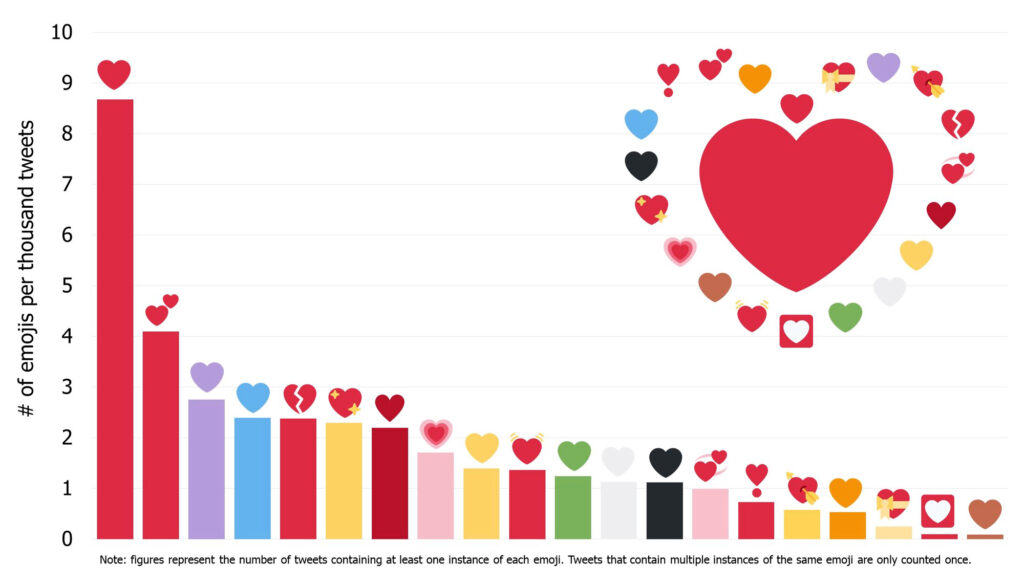 Глядя на 20 сердечек, мы видим их здесь в порядке популярности. Используя данные из Twitter, мы можем увидеть большое несоответствие между наиболее часто используемыми и наименее используемыми сердечными смайликами.