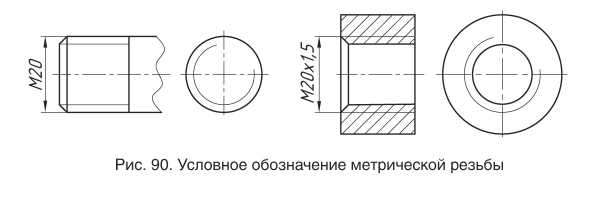 Основным типом резьбы, применяемой для крепежных целей, является метрическая резьба. Профилем метрической резьбы является равносторонний треугольник с углом 60° при вершине (рис. 89). В условное обозначение резьбы входят: буква М, наружный (номинальный) диаметр резьбы в миллиметрах (рис. 90).