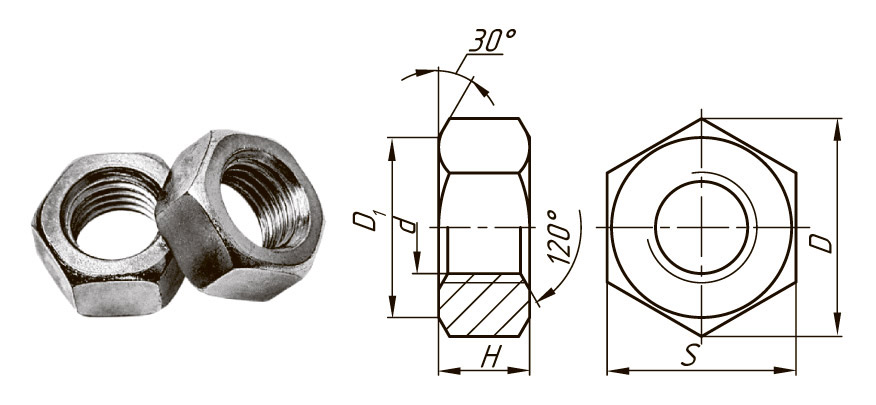 Гайка — крепежная деталь с резьбовым отверстием и конструктивным элементом для передачи крутящего момента. Применяется для навинчивания на болт или шпильку до упора в одну из соединяемых деталей. В зависимости от конструкции и условий применения гайки выполняют шестигранными, круглыми, барашковыми, фасонными и т. д. Наибольшее применение имеют гайки шестигранные. Пример условного обозначения гаек: Гайка Ml2 ГОСТ 5915-70 — с диаметром резьбы 12 мм, шаг резьбы крупный.