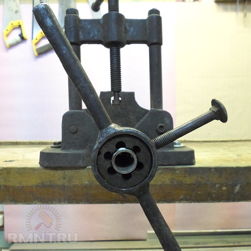 2. На трубу надевается резьбонарезной инструмент, который благодаря своей направляющей втулке, сразу встаёт перпендикулярно к трубе. Начинаем, одновременно прижимая, вращать его по часовой стрелке — плашка должна «зацепиться». Делаем примерно два оборота, откручиваем немного назад, чтобы сломалась стружка и добавляем масла. Нарезаем ещё 2–3 оборота — опять сдаём назад.