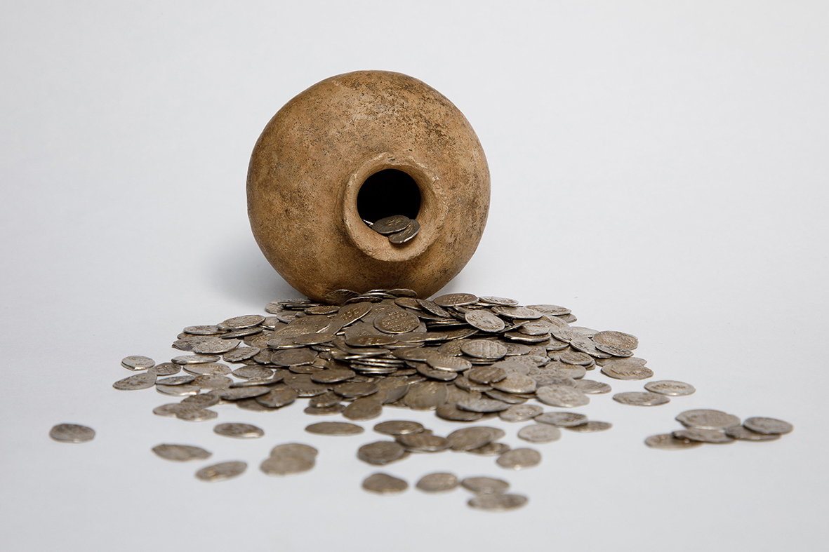 В нем хранился 61 серебряный слиток — древние рубли и полтины, которые