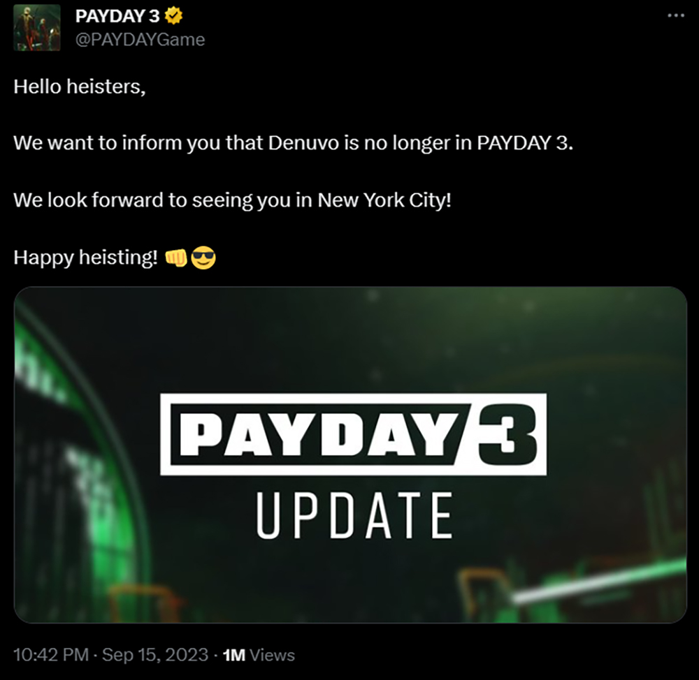 В последние годы у индустрии сложился тренд – издатели громко заявляют, что Denuvo в их игре не будет. Получается имиджевая история, которая, в том числе, и подстегивает продажи. К примеру, создатели PayDay 3 заявили, что убирают цифровую защиту из новой игры за несколько дней до официального релиза.
