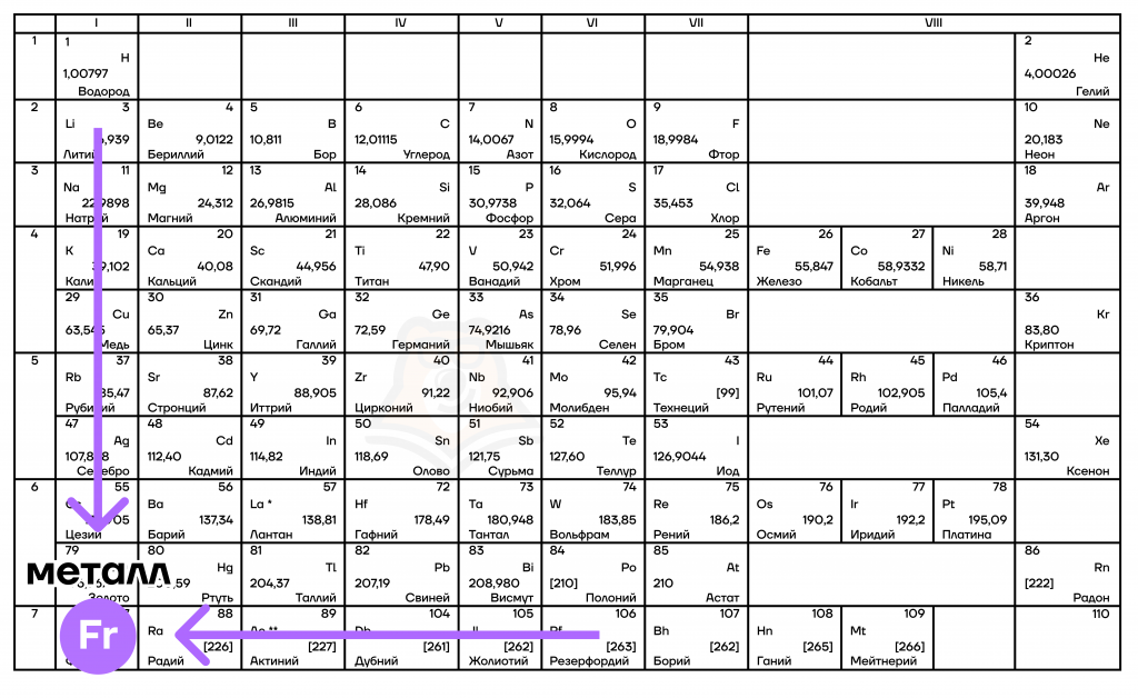 Для начала изучим свойства элементов, которые увеличиваются справа налево и сверху вниз при движении по таблице (т.е. при движении к францию – Fr).